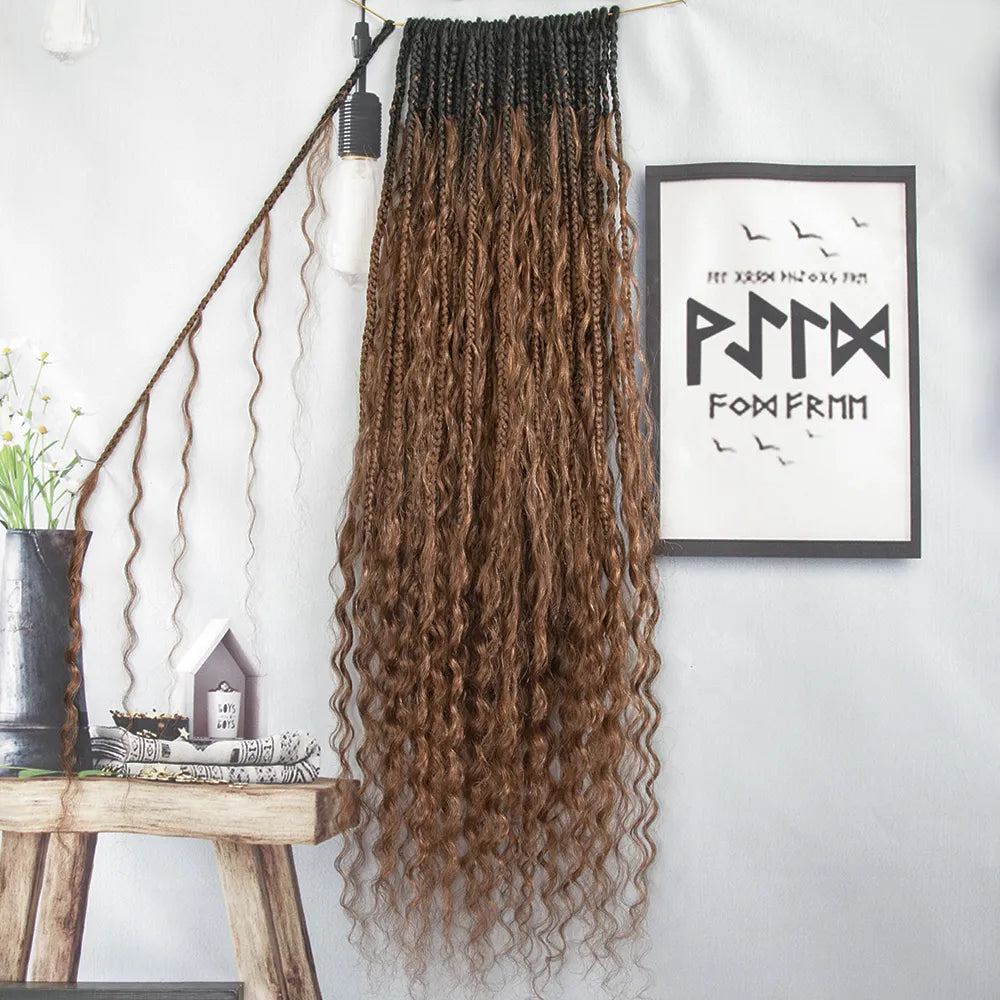 Ombre Brown Crochet Boho Box Braids with Human Hair Curls